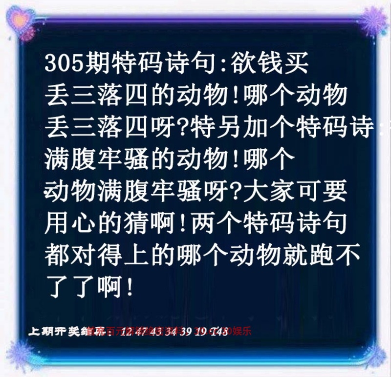 305期 欲钱买丢三落四的动物 解释:丢三落四解:牛鼠鸡马 欲钱买满腹牢骚的动物 解释:满腹牢骚解:兔羊狗 七肖:兔羊狗牛鼠鸡马 |